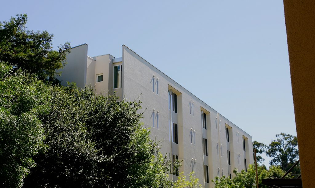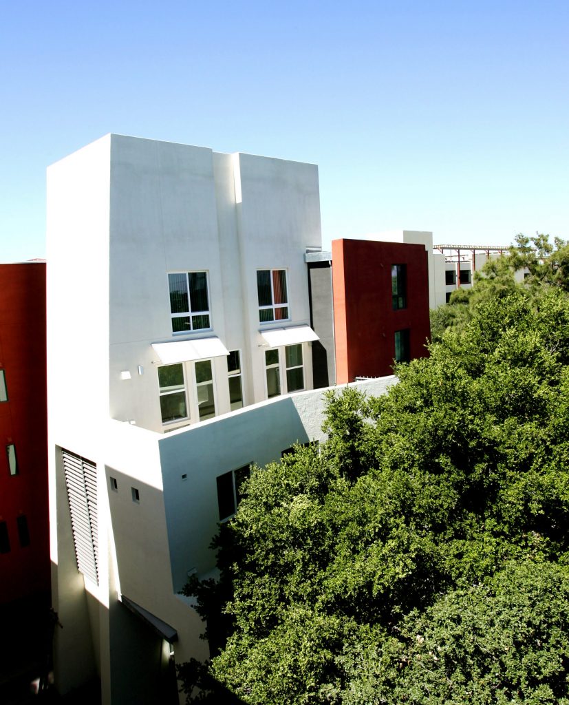 A major design goal was to achieve a building that projects a sense of dignity and belonging. Scaled arches welcome homeless families and residents to the main entry. The adjacent courtyard is shaded and sheltered by large oak trees that were carefully preserved to become the centerpiece of the project. The building’s mass is broken down with articulated facades, overhangs and awnings. A wooden rooftop trellis caps the stucco-clad walls. Large upper level decks provide 'eyes on the street' security while helping to make the project warm and welcoming.