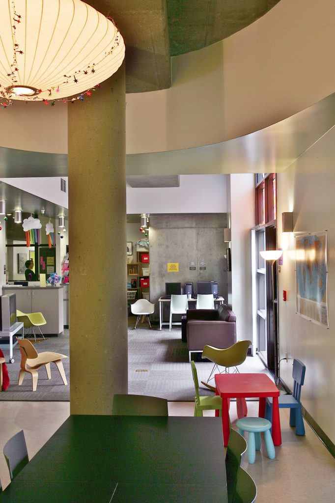 The ground floor functions as a community center for homeless individuals and families during the day. Here you find meeting rooms for informal gatherings and rehabilitation programs, classrooms, a computer lab, a small outpatient medical clinic, a hospitality kitchen, offices for caseworkers and social services administrators, laundry facilities, showers, lockers, and a storage/distribution area for donated clothes. Also on the ground floor is the Family and Children’s Center, complete with a living room, dining room, kitchen, laundry, and outside play area.