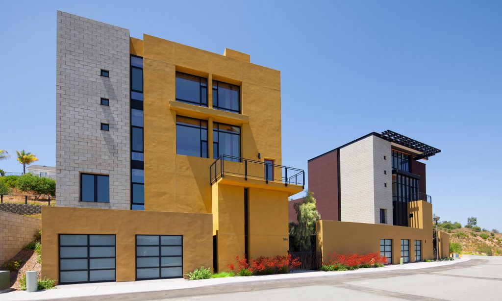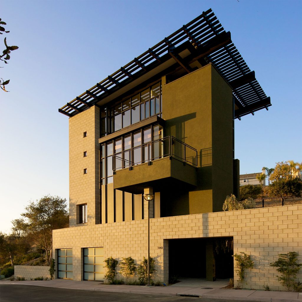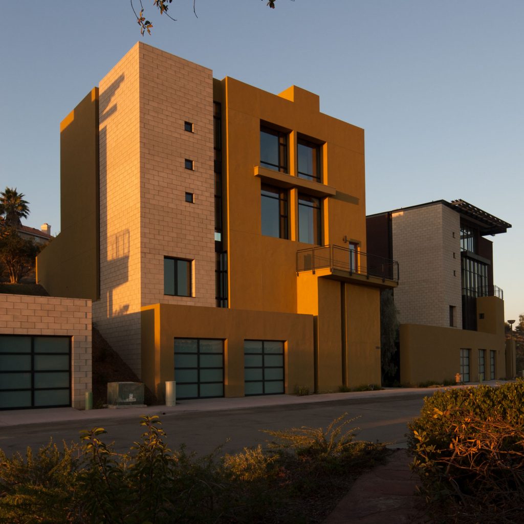 Three uphill houses have now been completed. The three-bedroom family-oriented houses stand four stories tall and include a domestic elevator. Although facades and fenestration vary, all three houses have the same floor plan. Each house also has a granny flat with its own garage suitable for a family member or work studio. The flat is accessible from a common street-level entry courtyard.