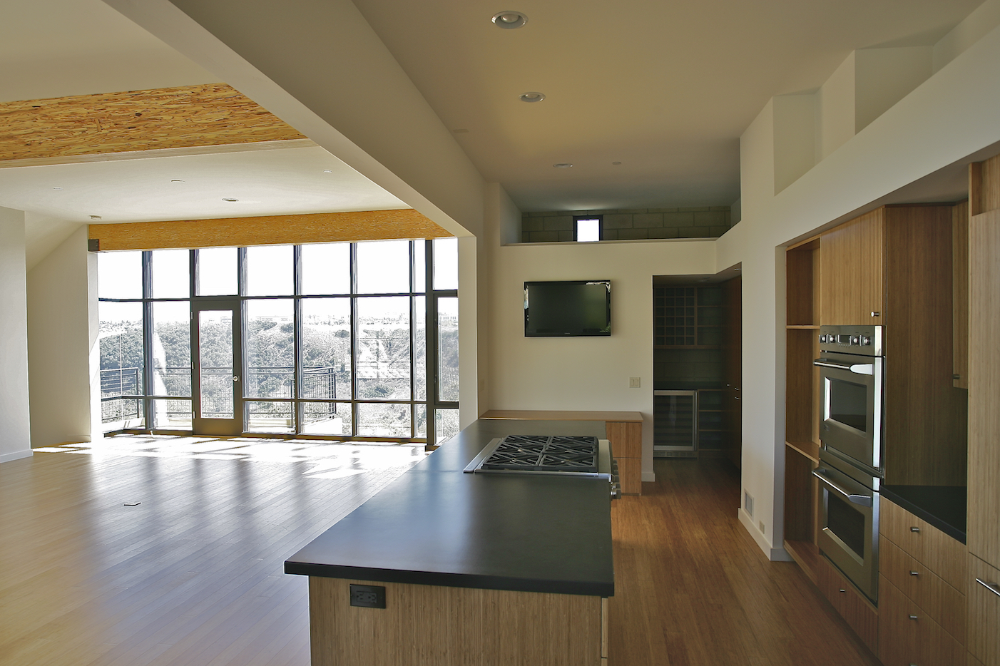 The first production house was built twice on the downhill side as part of the "tree filter" component of the plan. Simple and flexible in floor plan, a vaulted roof bonds the main space with the canyon below. Glazing is biased to the south sun and view. Moveable shoji screens and optional bookcase walls make a variety of living arrangements possible.